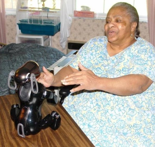 Tamura et al. Presentanron a AIBO a varios adultos mayores que vivían en una casa de geriatría y observaron sus reacciones [14]. Hallaron que aunque los pacientes reconocen a AIBO como un robot, una vez que se dotaba de una envoltura parecido a un peluche al robot, los pacientes los percibían como un perro o un bebe. La presentación de AIBO presentó resultados positivos para pacientes con demencia severa, incluyendo un incremento en la comunicación de los pacientes con AIBO, lo que demuestra la efectividad de esta rehabilitación como herramienta para el tratamiento de pacientes con demencia severa.