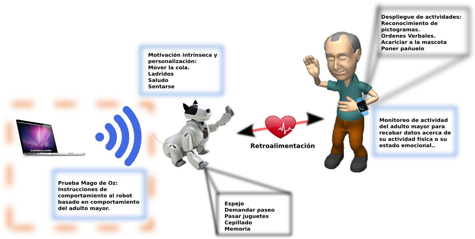 Sin embargo, hay avances en nuevos campos de la robótica, donde la meta no es proporcionar solo asistencia física sino proporcionar estimulación a los humanos a través de interacción con el robot [12]. Se han desarrollado estudios en los cuales se hace uso de este tipo de robots mascota para proporcionar apoyo a adultos mayores.