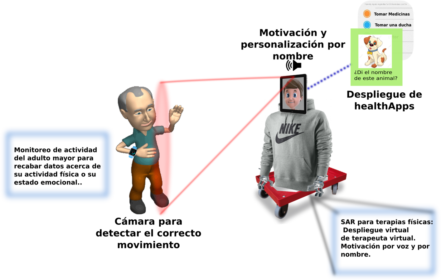 - Un SAR con aspecto humano que pueda fungir un papel de “mascota” para motivar las actividades físicas y cognitivas con un alto grado de motivación y personalización hacia cada usuario.