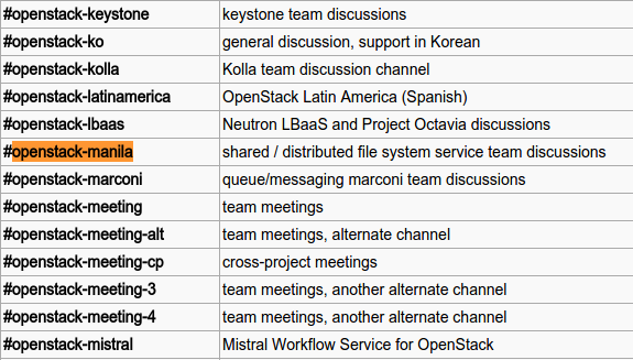 4. https://wiki.openstack.org/wiki/IRC: many many chanel for discuss arround openstack