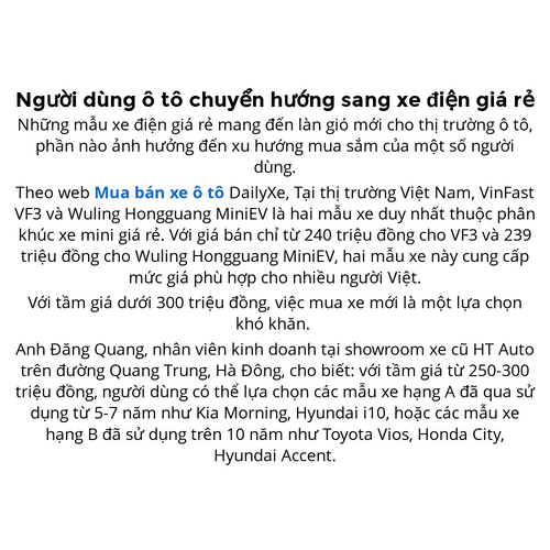 Những mẫu xe điện giá rẻ mang đến làn gió mới cho thị trường ô tô, phần nào ảnh hưởng đến xu hướng mua sắm của một số người dùng. Theo web Mua bán xe ô tô DailyXe, Tại thị trường Việt Nam, VinFast VF3 và Wuling Hongguang MiniEV là hai mẫu xe duy nhất thuộc phân khúc xe mini giá rẻ. Với giá bán chỉ từ 240 triệu đồng cho VF3 và 239 triệu đồng cho Wuling Hongguang MiniEV, hai mẫu xe này cung cấp mức giá phù hợp cho nhiều người Việt.