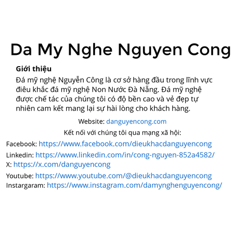 Đá Mỹ Nghệ Nguyễn Công chuyên điêu khắc các sản phẩm tượng đá mỹ nghệ với đa dạng mẫu mã. Đá Nguyễn Công luôn là lựa chọn hàng đầu cho những ai yêu thích nghệ thuật đá.