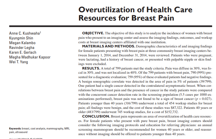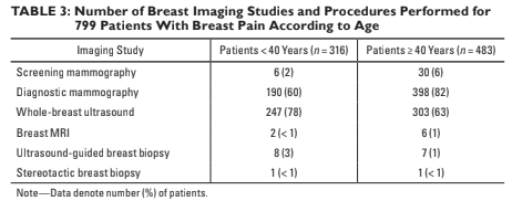 Analyze the imaging findings, outcomes, and workup costs for women with breast pain - with the intent of determining whether or not it is reasonable to do so.