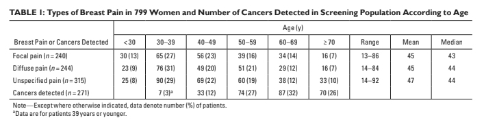 - Breast pain is the primary indication for almost 50% of patients that presented at a large HMO.