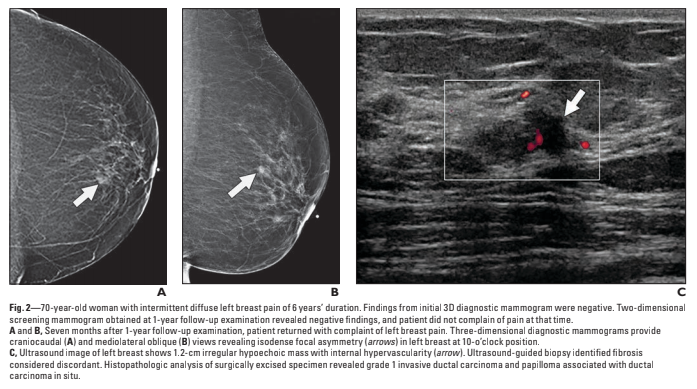 P - Population: Female patients at 3 community imaging centers in 2014 with breast pain.