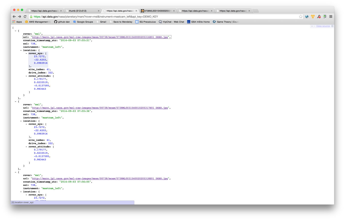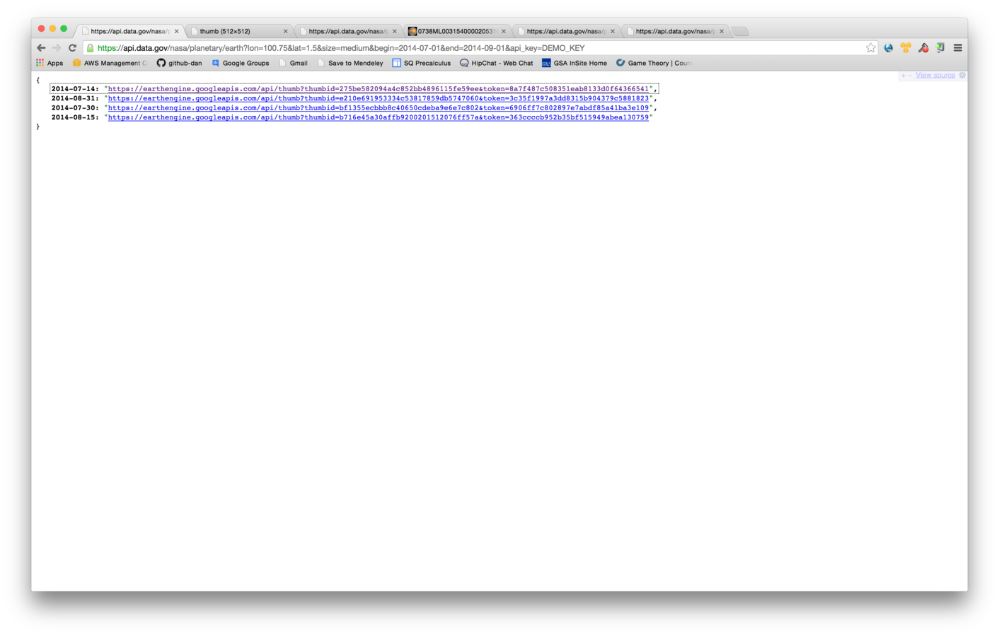 Given an earth-bound coordinate and a date range, return all available NASA imagery of that point.