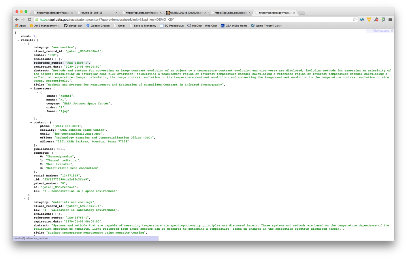 Given a search query, return all publicly available NASA patents that contain the search term along with concept tags from the official patent text, structured in a way to match the DOE and NIH patents.