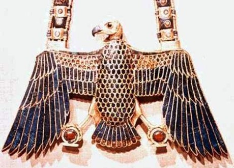 Esta jóia egípcia foi encontrada na tumba do faraó Tutankhamen, que reinou durante a XVIII dinastia (c.1330 a.C.). É uma peça de ouro com forma de abutre, esmalte aplicado e pedras preciosas.