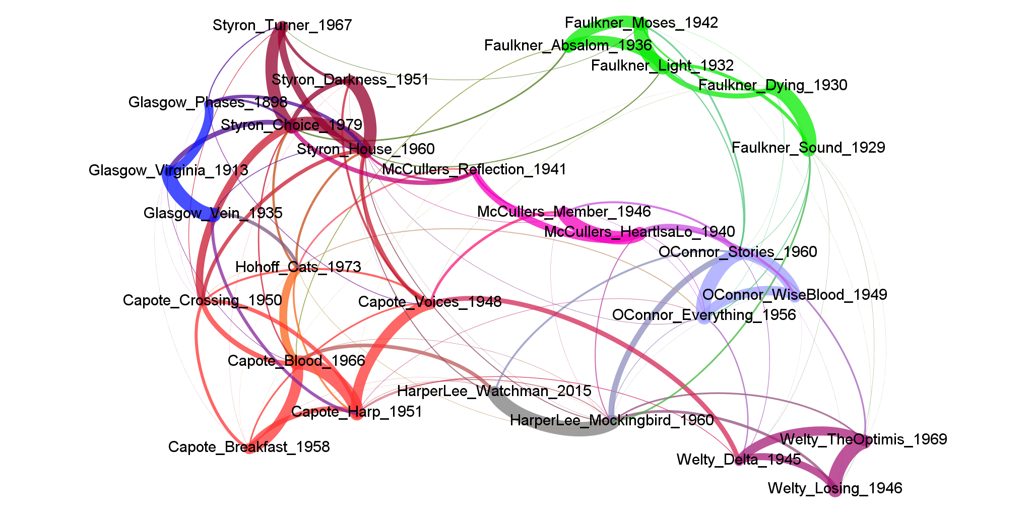 То же самое в виде сети стилометрической близости: