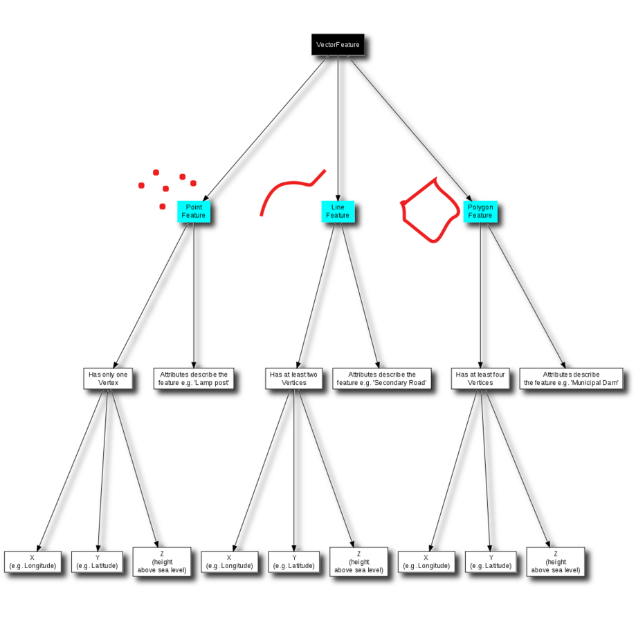 A vector feature has its shape represented using geometry. The geometry is made up of one or more interconnected vertices. A vertex describes a position in space using an X, Y and optionally z axis. Geometries which have vertices with a Z axis are often referred to as 2.5D since they describe height or depth at each vertex, but not both.