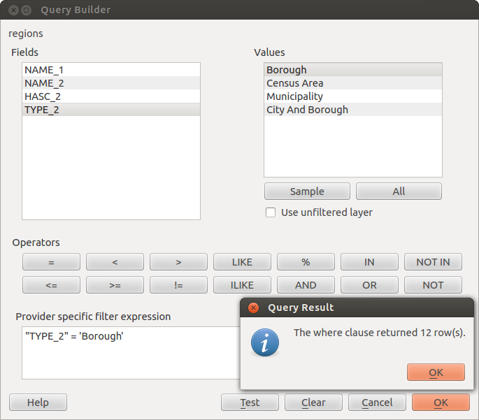 The Fields list contains all attribute columns of the attribute table to be searched. To add an attribute column to the SQL where clause field, double click its name in the Fields list. Generally you can use the various fields, values and operators to construct the query or you can just type it into the SQL box.