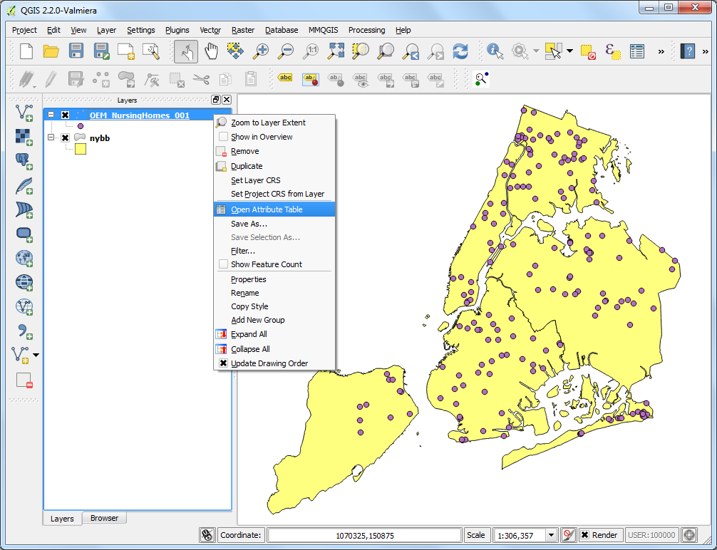 Now that we have described what vector data is, let’s look at how vector data is managed and used in a GIS environment. Most GIS applications group vector features into layers. Features in a layer have the the same geometry type (e.g. they will all be points) and the same kinds of attributes (e.g. information about what species a tree is for a trees layer).