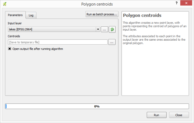 Once you double-click on the name of the algorithm that you want to execute, a dialog similar to that in the figure below is shown (in this case, the dialog corresponds to the ‘Polygon centroids’ algorithm).