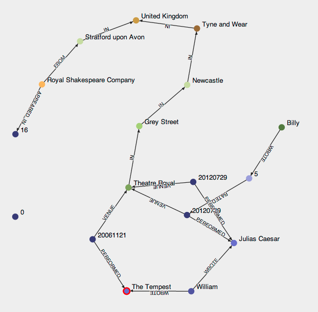 START theater =node:node_auto_index(theatre = 'Theatre Royal'), newcastle=node:node_auto_index(city = 'Newcastle'), bard =node:node_auto_index('firstname:William AND lastname:Shakespeare') MATCH (newcastle)<-[:IN*1..4]-(theater) <-[:VENUE]-(performance) -[:PERFORMED]->(play) <-[w:WROTE]-(bard) WHERE w.date > 1608 RETURN play