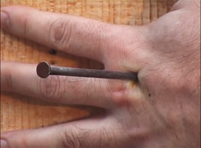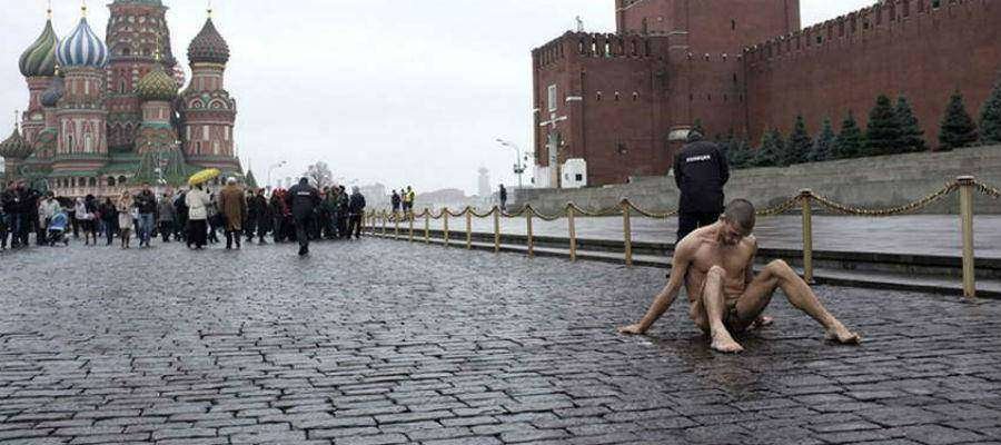 Petr Pavlensky, the artist, nailing his testicles to the Red Square (with the Cathedral of St Basil in the background)