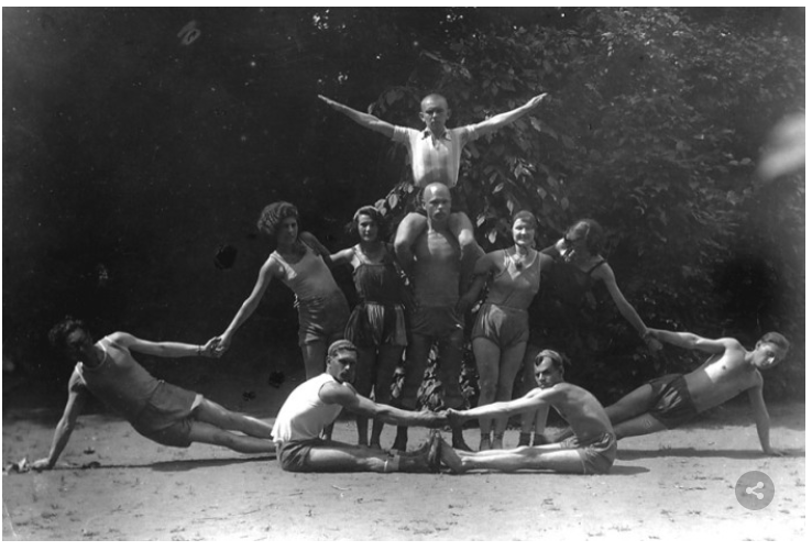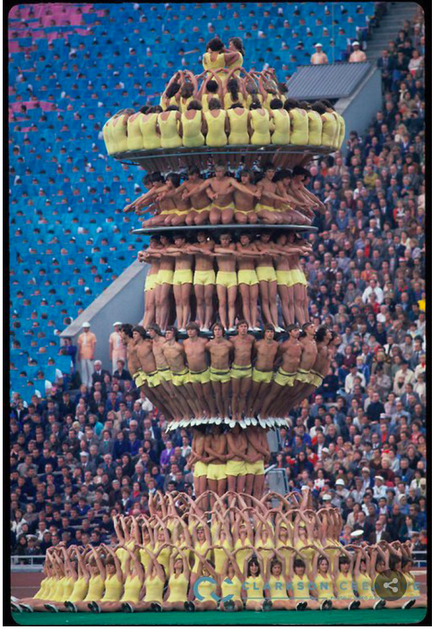 Popular Soviet practice of human sculpture-tower. Image: a summer camp (1939) and 1980's Russian Olympics Opening ceremony.