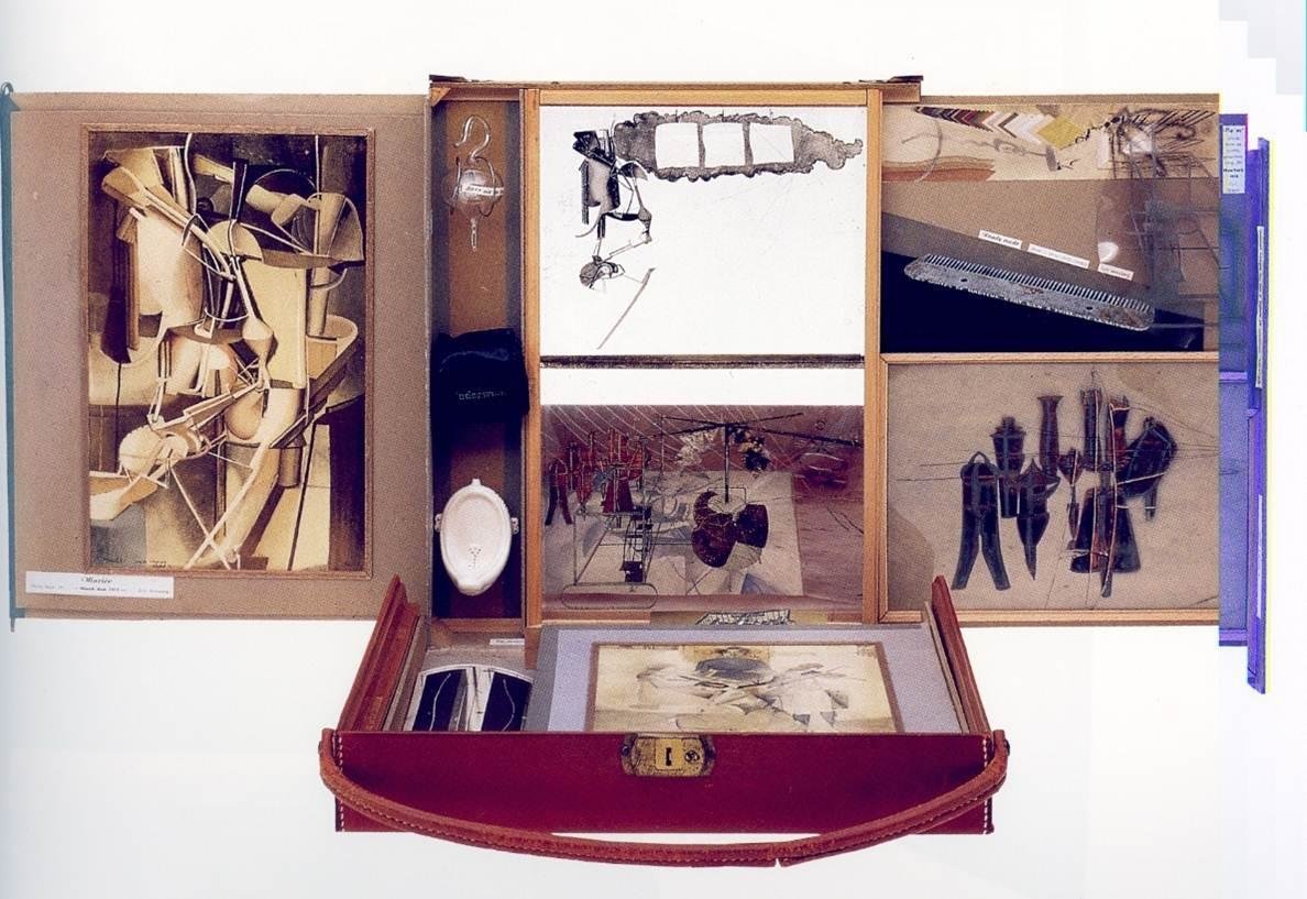 Marcel Duchamp. Boite-en-Valise (Box in a Suitcase), 1935-41. Leather suitcase containing miniature replicas of Duchamp's works, made when artist immigrated to America.
