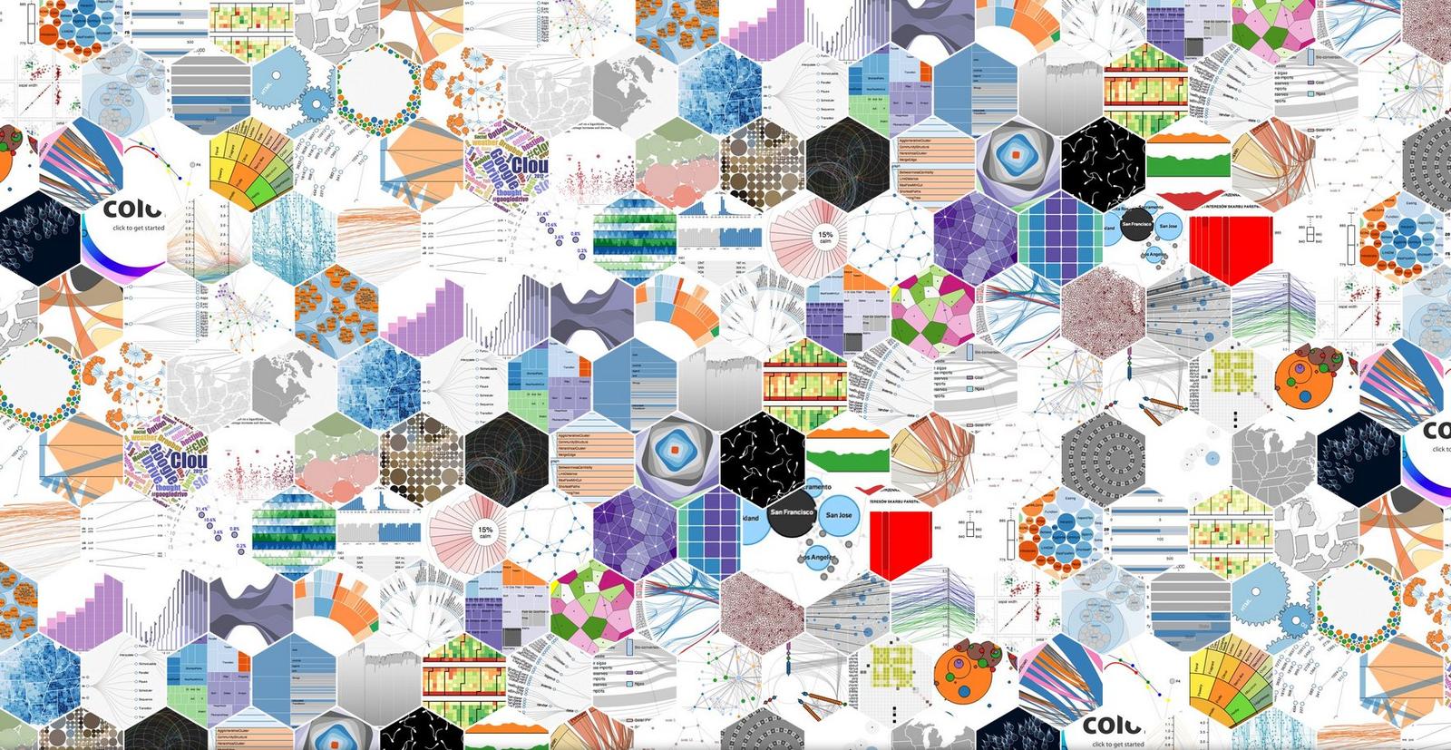 There are several (un)common charts and endless combinations: scatter plots, lines, bars, areas, pies, donuts, bubble charts, treemaps, word clouds, alluvional diagrams, dendrograms, networks, streamgraphs, gauges, chord diagrams, motion charts, parallel coordinates, sankey diagrams, maps, choropleth, ...