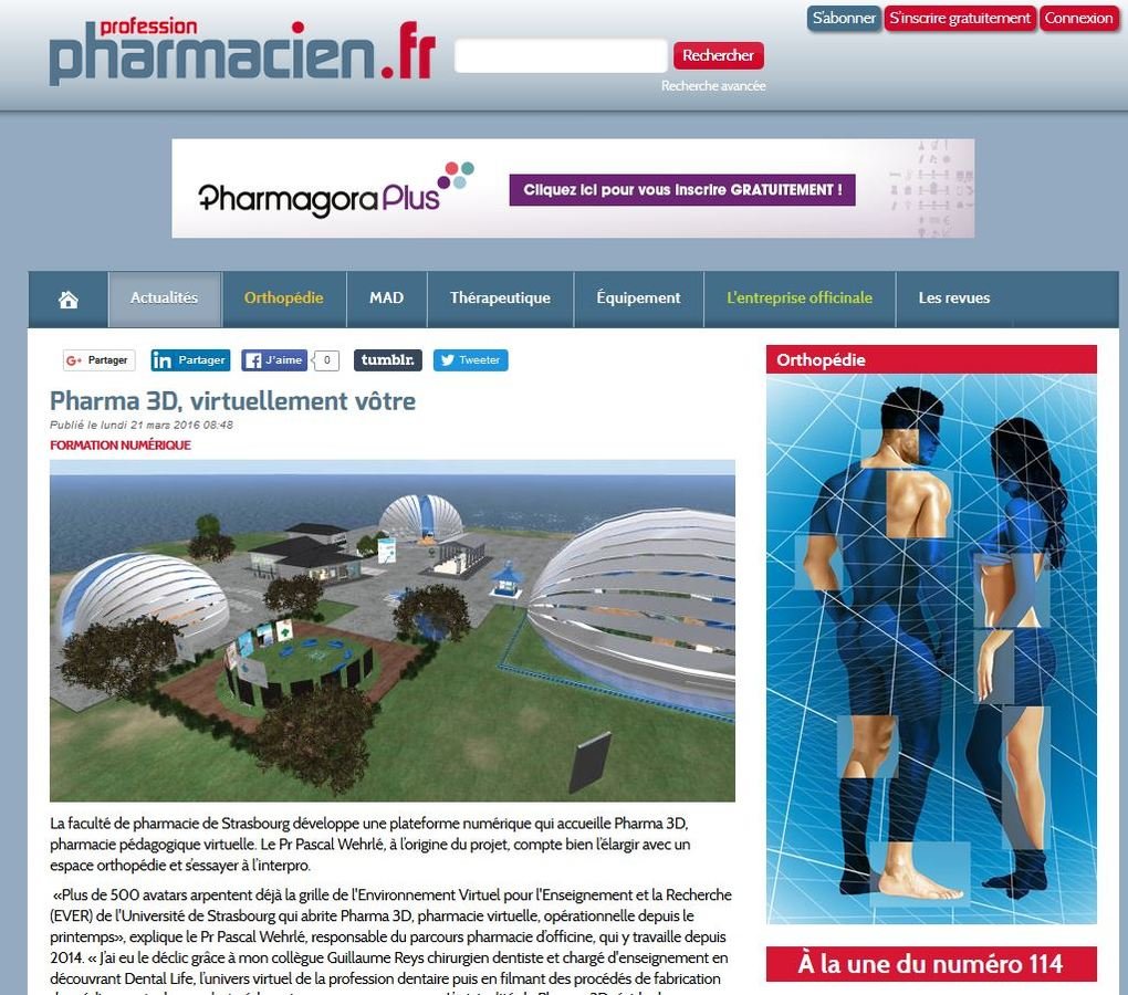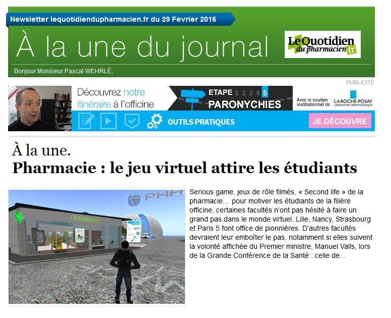 La réalité virtuelle de Pharma3D, dispositif innovant et interactif, permet des mises en situations étudiant/pharmacien au travers de scénarios pédagogiques et contribue ainsi à la formation des étudiants au métier de pharmacien d'officine en les confrontant à de multiples situations qu'ils seront susceptibles de vivre dans la vraie réalité de leur futur exercice professionnel.
