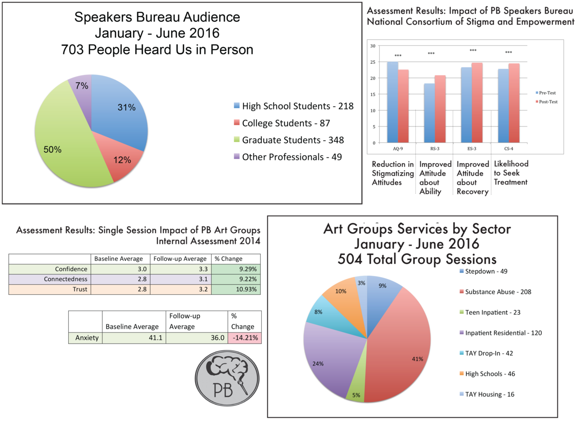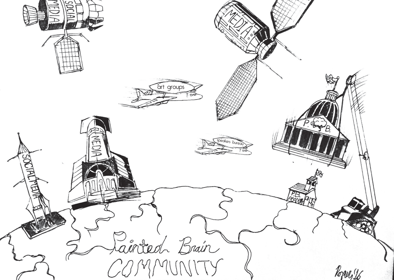 Painted Brain gets its message out in person through our speakers bureau seen by more than 700 students in the first half of 2016. Online we reach people through our Newspaper, the Painted Brain Magazine, and our social media channels which has seen growth by 1800% in the past year to over 60,000 followers.