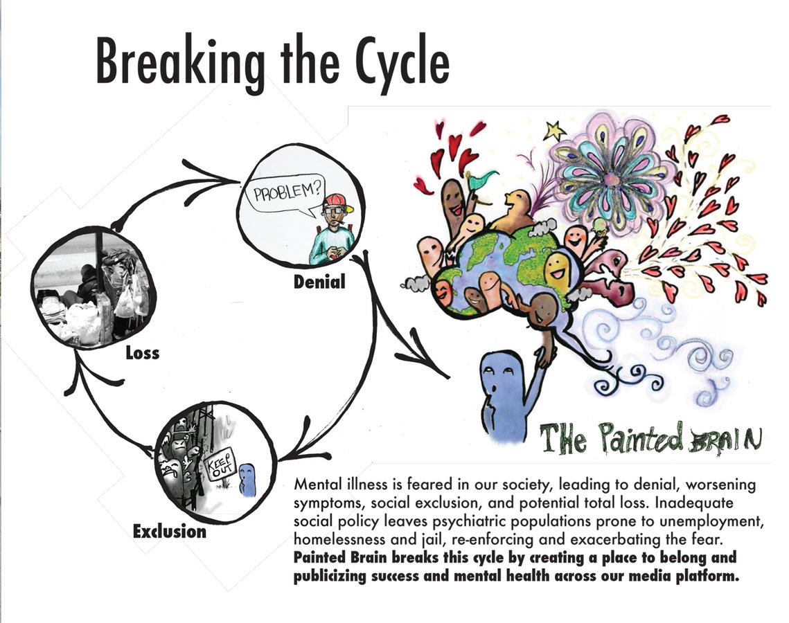 Painted Brain is meeting two of the biggest needs in mental health: a place to fit in and a makeover for mental illness. Painted Brain provides a safe space for people with mental illness to find community and purpose, open to all. It also challenges what mental illness looks like to the public through our media projects, social media campaigns and public events in Los Angeles (so far).