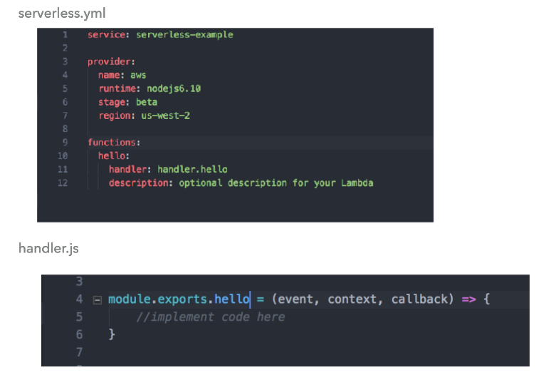 Serverless defines a single simple YAML configuration file and corresponding handler functions that are translated to CloudFormation templates and .zip files for deployment in AWS.