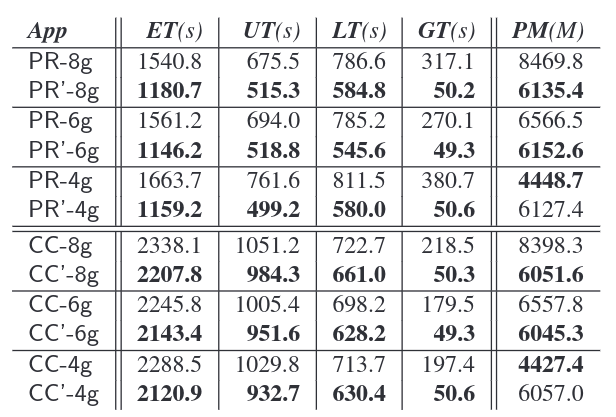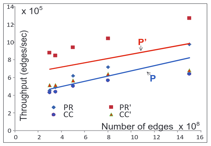 Performance comparison of page rank (PG) and connected components (CC) on twitter-2010 dataset