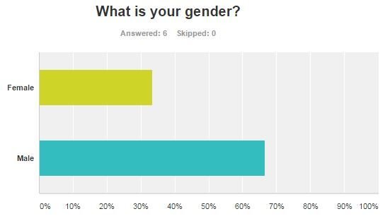 Within my online survey I have gained 6 responds with 2 being female and 4 male, whereas within my paper based questionnaire I have gained feedback from a equal spread of 4 females and 4 males.Overall I believe that the feedback which I have been given has come from a varied audience (mix of male and female) which was very beneficial for me as I was allowed to gain different point of views depending on the audiences gender.