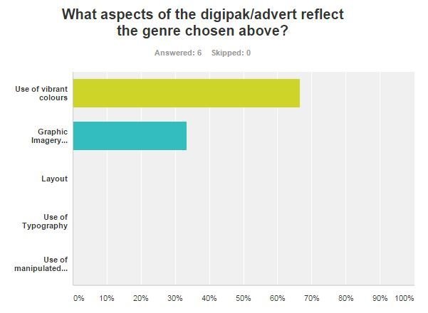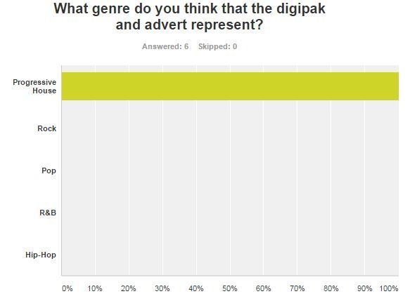 which selected "Pop" as the answer. Concluding, from this question I have understood that my audience has clearly identified the Progressive House genre within my digipak and advert therefore I have made sure that my work has been effective and met the Progressive House standards that I have researched and implemented into my work.