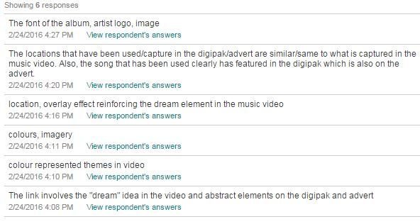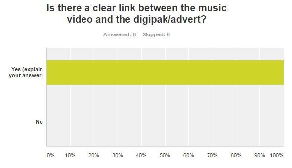 Within my construction stages of the digipak and advert, I have taken into account the need for a clear link to be portrayed within the two mediums and the music video as this is what I have been portrayed within the necessary research. Within my ancillary task I have targeted to implement location imagery as well as a vibrant colour scheme in order to interlink it with the music video. As a result of this, I have asked my audience this question in order to see if they can clearly see the interlinking features that appear on both the digipak/advert and the music video. Within the 8 paper questionnaires I have been given 8 'Yes' answers (100%) and within the 6 online questionnaire results, I have been given 6 'Yes" answers (100%). Considering the positive answers, I have asked the respondents to elaborate on their choice where comments such as "Same locations have been captured","Colours & Imagery" as well as "The patterns you have used" could be seen. Considering the unambiguous feedback, I believe I have carried out a good job at my digipak construction as I have thoroughly thought about the features which I would include which as a result created a corporate image with the music video.