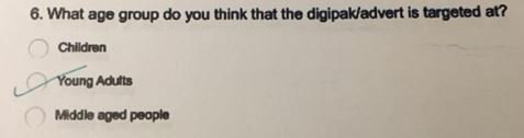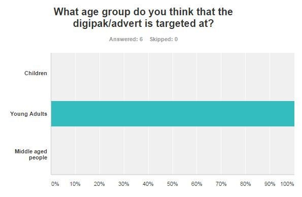 /advert from individuals who represent today's youth. Within my paper questionnaire 8/8 respondents have specified "Young Adults" as their answer, similar to the online based where 6/6 respondents have selected the same answer. This as a result has portrayed me with a 100% agreement within the range of individuals who have answered my questionnaire, therefore portraying to me that I have successfully targeted my digipak and advert at my set 16-25 year old target audience.