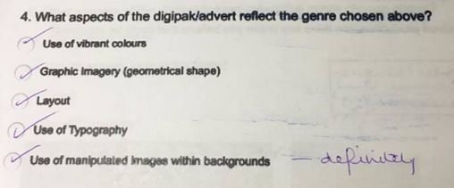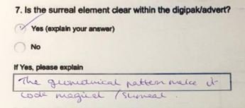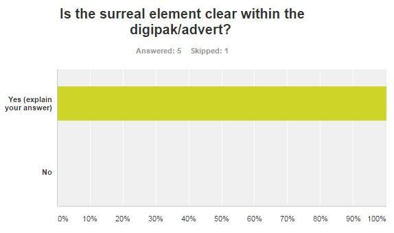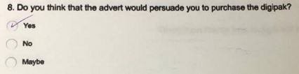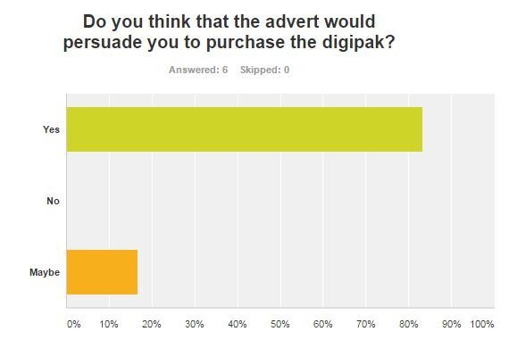 In order to test out the digipaks and adverts attractiveness and uniqueness I have asked the audience a question which would reflect a real life situation. The question has asked that if they saw the advert in public would they be persuaded onto purchasing the digipak. The results from the above question are as below: Paper questionnaire 6/8 have answered "yes" whereas 2/8 specified "maybe" as their answer. On the other hand, within my online questionnaire 5/6 have answered "Yes" with one respondent selecting "maybe". Throughout the two questionnaires which I have given out, the majority of the audience has responded by selecting the answer