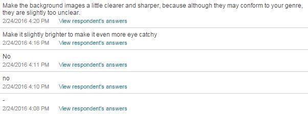 In order to diverse my questionnaire and not only gain feedback from the audience, I have designed a question that has specified the audience to suggest any further improvements to my ancillary task. Within the 13 responds that I have been given, 3 people from the paper based questionnaire and 3 people from the online based questionnaire have specified that "No further improvements are needed". On the other hand, the rest of respondents from both