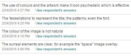 One element of my research which I have then applied further into my exploration, was the development of the 'surreal element' into my digipak/advert. I have found that most Progressive House artists have implemented a surreal mood to their work (video, digipak/advert) which I have found quite common, therefore chosen to apply it within my work. I was worried that the surreal mood was not quite clear within my work which is why I have placed such question within the questionnaire. The feedback which I have gained has been gone against my assumptions, as all of the 14 respondents specified that the surreal element was very clear due to elements such as the "Geometrical shape pattern - magical/surreal look" , "The use of colour and the artwork make it look psychedelic which is effective" or even "The "space" image overlay". I have mainly approached the surreal element by