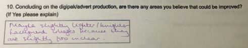 Concluding, I believe that the feedback analysis has portrayed vital points about my digipak and advert whether they were positive or negative such as the improvements. Overall, the opinions were very positive and the audience was quite satisfied with the final outcomes which I am very pleased to hear. The analysis of the results has helped me to understand my target audiences point of view which is quite beneficial as I was given the chance to test out my product and gain valuable, real life feedback.