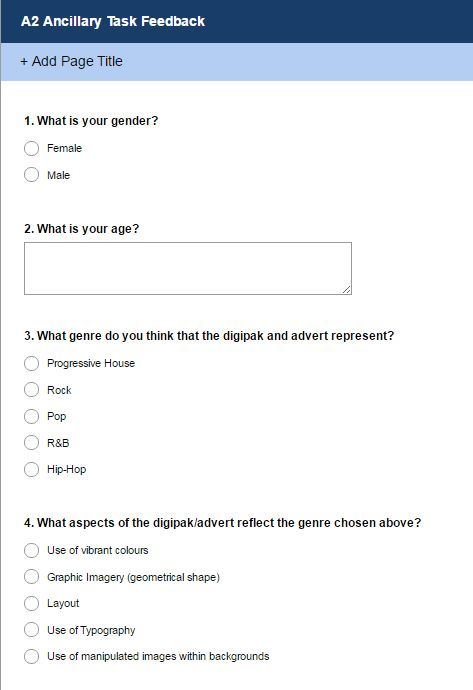 Within the earlier stages of my music video production I have specified that my target audience would mainly fit into the 16-25 year old age group therefore I have targeted a young, adrenaline fueled audience which I then have attempted to represent by the use of colour, and texture which is mainly associated with Progressive House. In order to ensure myself that the digipak and advert are targeted at the right age group I have asked the above question within the questionnaire. Considering the fact that the individuals within my feedback audience range in ages of 17 and 18 years old, they as a result fit into my target audience profile therefore allowing me to gain first-hand experience of my digipak