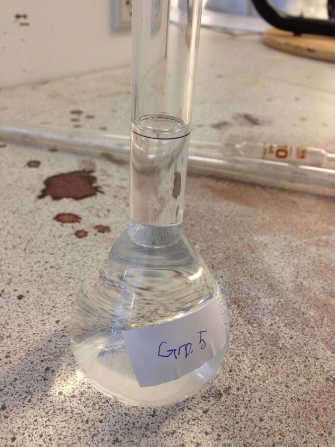 Vi puttede først NaCl i og derefter hældte vi lidt vand i, så vi kunne opløse saltet optimalt. Efter alt saltet var opløst, så kunne vi hælde vand op til 100mL mærket på målekolben.