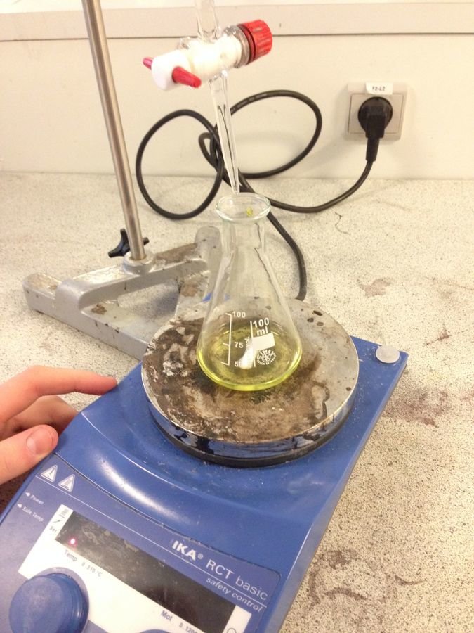 I den koniske kolbe er der blevet tilsat 10mL saltvand fra en anden gruppes opløsning. Der er yderligere blevet tilsat 5 dråber kaliumchromat-opløsning som en indikator og til sidst en magnet. Kolben er blevet sat oven på en magnetomrører. Buretten indeholder 0,1M AgNO3, som er blevet fyldt helt op til nulmærket.
