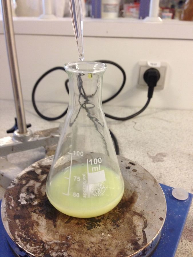 Herefter sker tildrypning af sølvnitratet indtil én dråbe giver væsken en blivende rød farve.