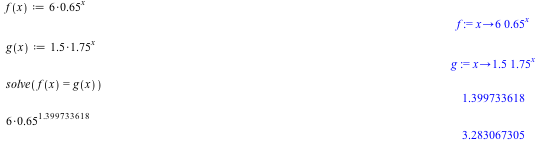 Jeg sætter de eksponentielle funktioner lig hinanden og finder x. Herefter sætter jeg x ind i en af funktionerne og finder y.