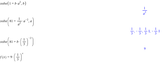 Jeg har to funktioner som jeg kender x og y på. Først isolerer jeg b i den første funktion. Herefter isolerer jeg a i den anden og får a til 1/3. Herefter sætter jeg a ind og isolerer b, som jeg får til 9. Nu har jeg a og b og kan lave forskriften for f.