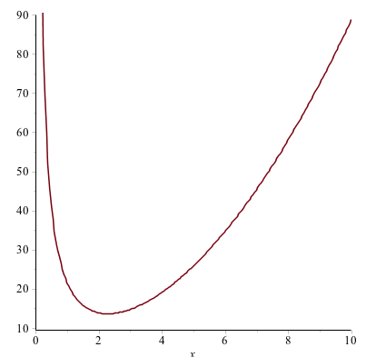 c) Den første del ( ) af funktionen er udtrykket for arealet af de to trekanter på figuren. Den sidste del af funktionen findes ved at isolere y fra forrige udtryk med rumfanget af figuren. Da jeg kender den konstante volume på 3, så kan jeg isolere y. Jeg får herefter udtrykket for den sidste del af funktionen.