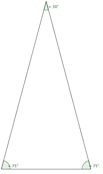 Hver trekant har altså en vinkel B, som er 30 grader. I et regulært polygon er alle trekanterne ligebenet, og da vinkelsummen for en trekant er 180 grader, så må hver af de resterende vinkler være: