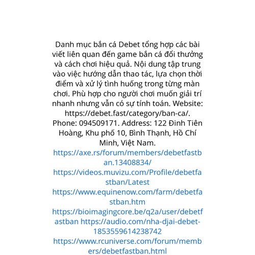 Website: https://debet.fast/category/ban-ca/https://debet.fast/category/ban-ca/ Danh mục bắn cá Debet tổng hợp các bài viết liên quan đến game bắn cá đổi thưởng và cách chơi hiệu quả. Nội dung tập trung vào việc hướng dẫn thao tác, lựa chọn thời điểm và xử lý tình huống trong từng mà