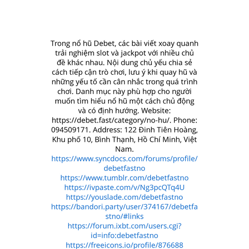 Website: https://debet.fast/category/no-hu/. Trong nổ hũ Debet, các bài viết xoay quanh trải nghiệm slot và jackpot với nhiều chủ đề khác nhau. Nội dung chủ yếu chia sẻ cách tiếp cận trò chơi, lưu ý khi quay hũ và những yếu tố cần cân nhắc trong quá