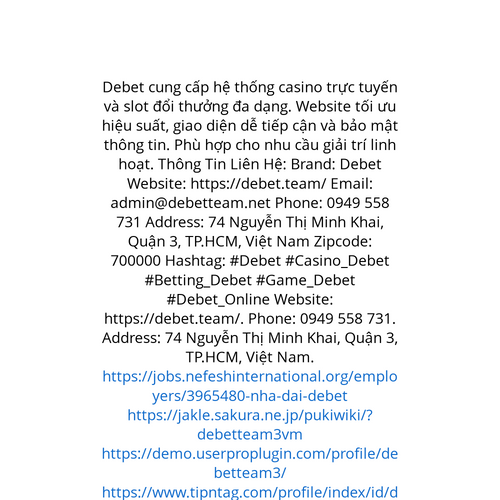 Website: https://debet.team/. Debet cung cấp hệ thống casino trực tuyến và slot đổi thưởng đa dạng. Website tối ưu hiệu suất, giao diện dễ tiếp cận và bảo mật thông tin. Phù hợp cho nhu cầu giải trí linh hoạt. Thông Tin Liên Hệ: Brand: Debet Website