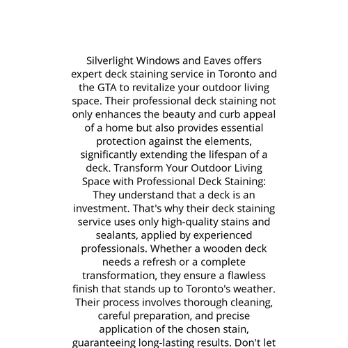 Website: https://silverlightwindowsandeaves.ca/deck-staining-toronto/ Silverlight Windows and Eaves offers expert deck staining service in Toronto and the GTA to revitalize your outdoor living space. Their professional deck staining not only enhances