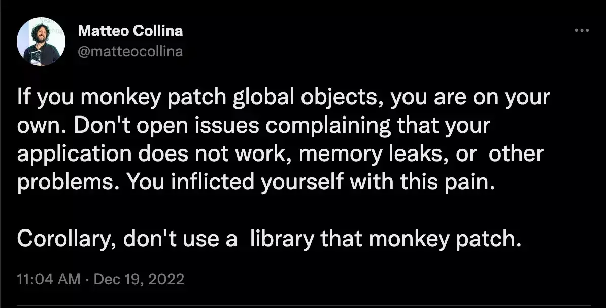 Matteo Collina (Node.js Technical Steering Committee member) warning against monkey patching global objects.