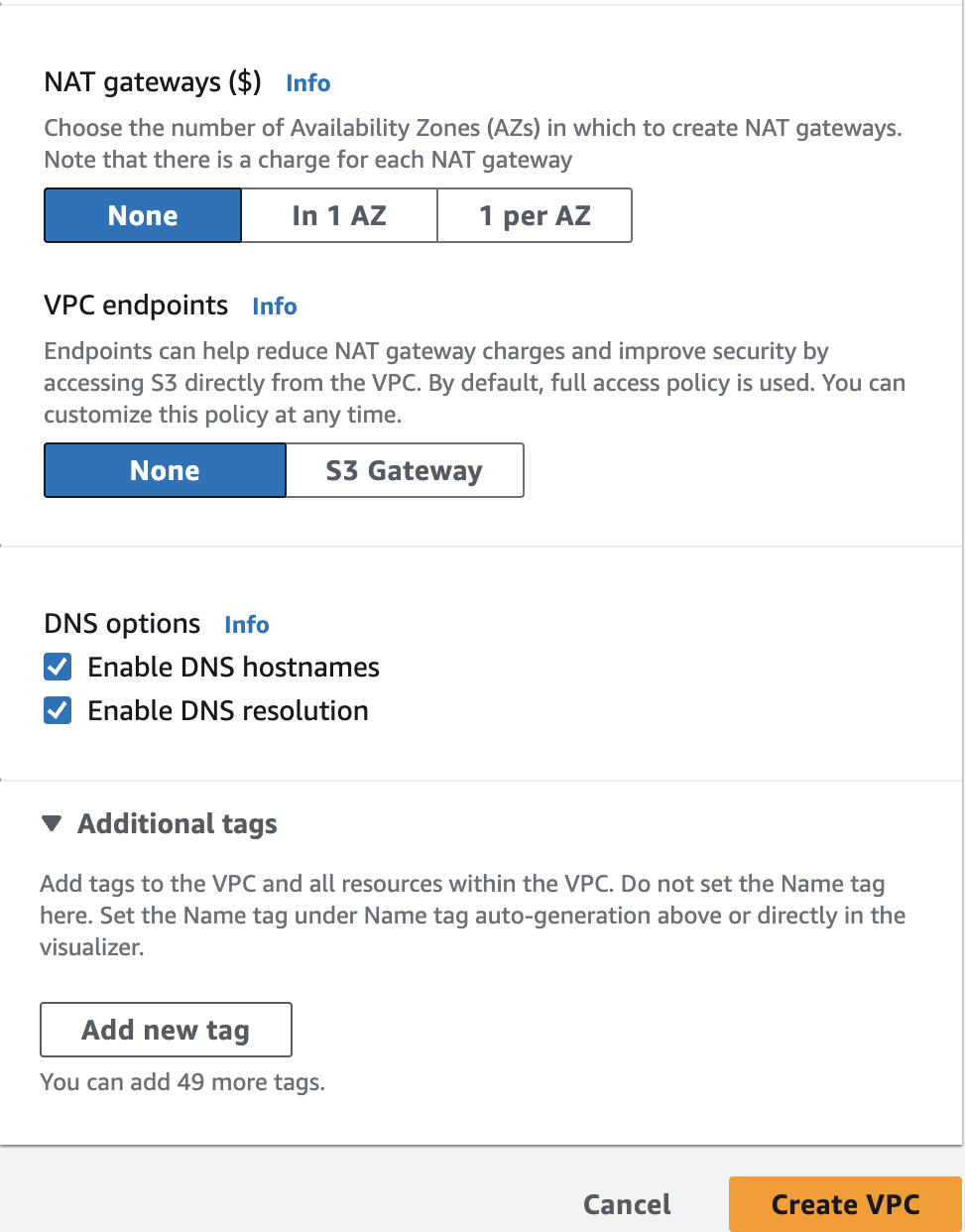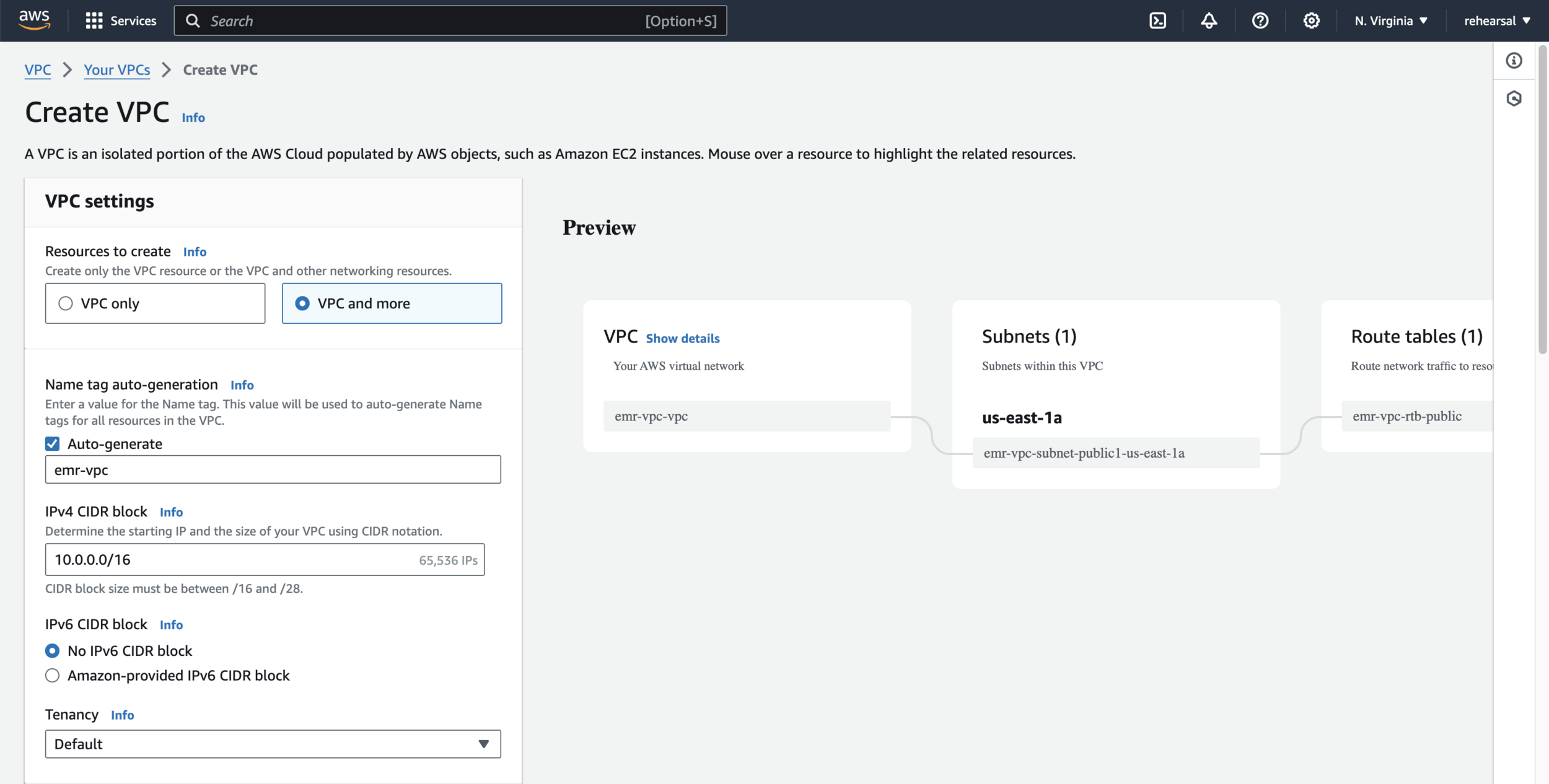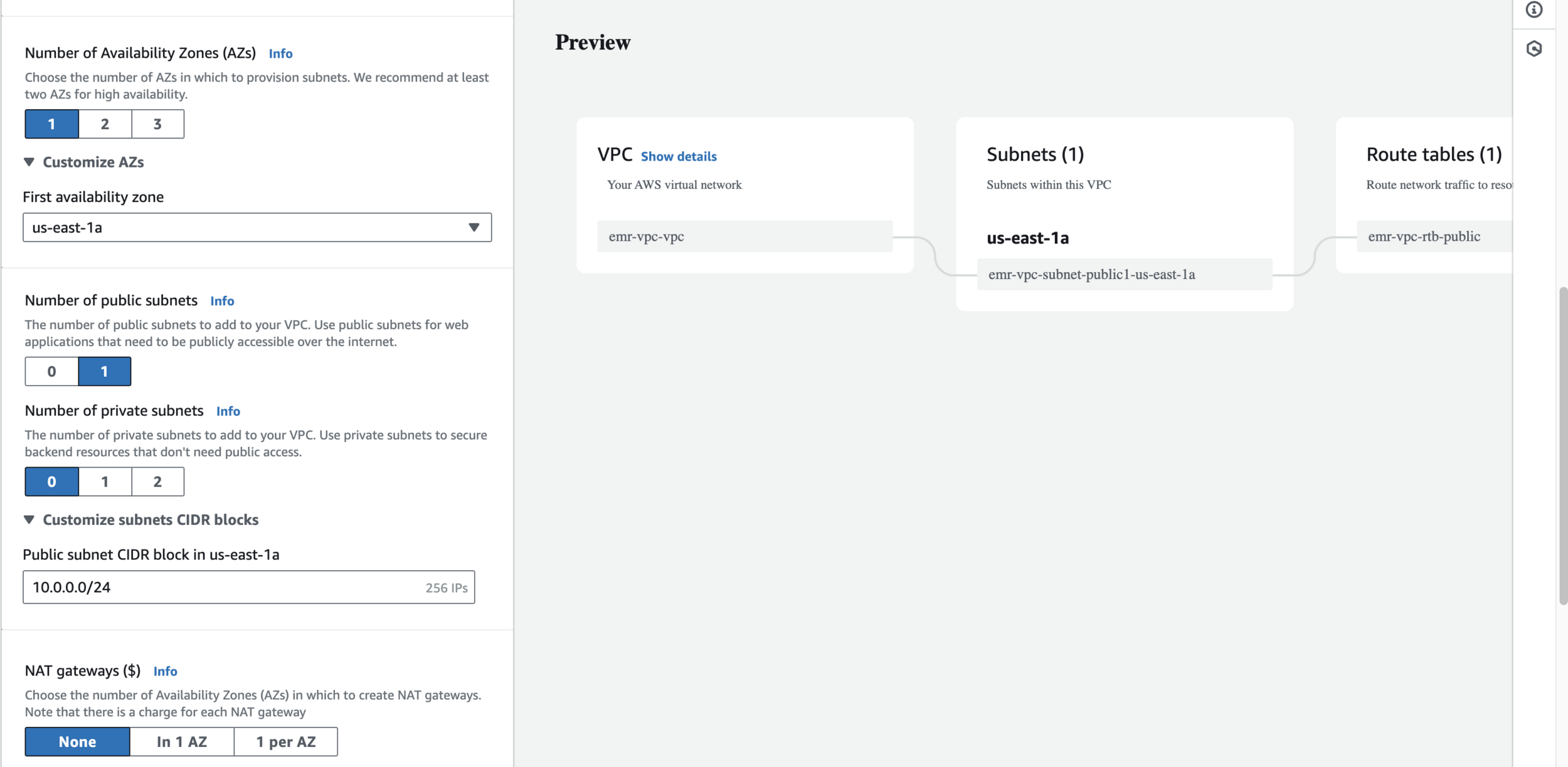 aws s3 cp data.csv s3://$BUCKET_NAME/data.csvCreate a dedicated VPC to host your EMR Cluster shown as below - part 1
