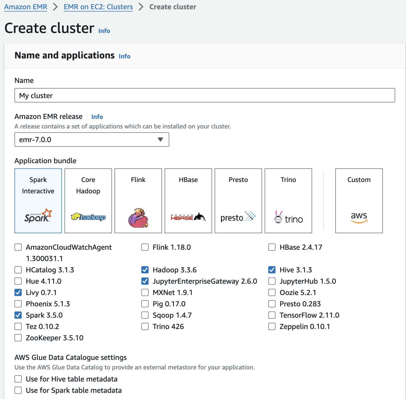 Create an Amazon EMR Cluster as follows - Name and applications